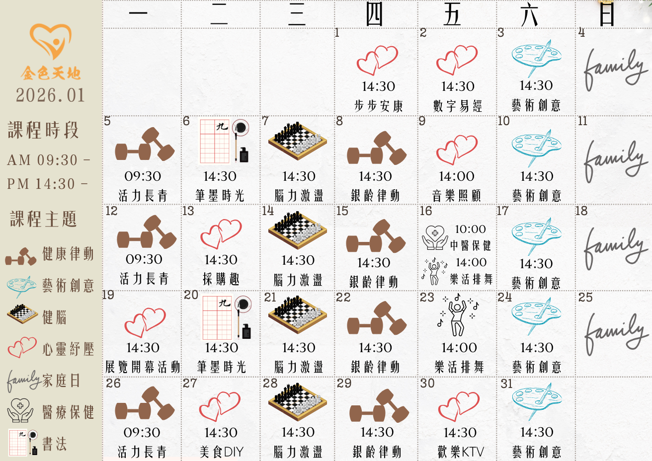 根據國民健康署所提『活躍老化』的定義:提升老年期生活品質,並達到最適宜的健康、社會參與及安全的過程。 我們設計有效完整課程,提供促進健康、增強體適能的服務。或根據個人專長協助設計課程,與創造自我實現的成就感。 透過社團活動,增進人際互動,豐富生活經驗。設計合適的體能運動,提升身體機能。 尊重個人宗教信仰,滿足心靈需求。